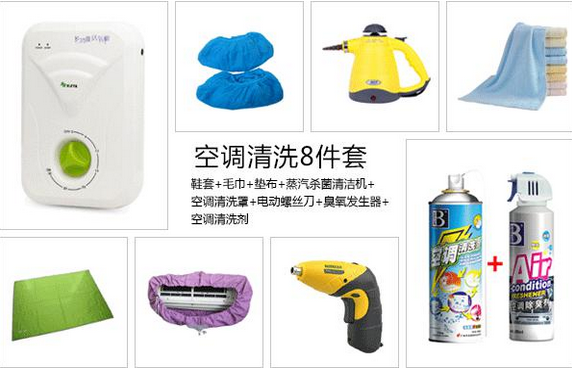 空調(diào)清洗8件套,包括:鞋套、毛巾、墊布、蒸汽殺菌清潔機、空調(diào)清洗罩、電動螺絲刀、臭氧發(fā)生器和空調(diào)清洗劑。